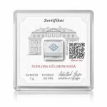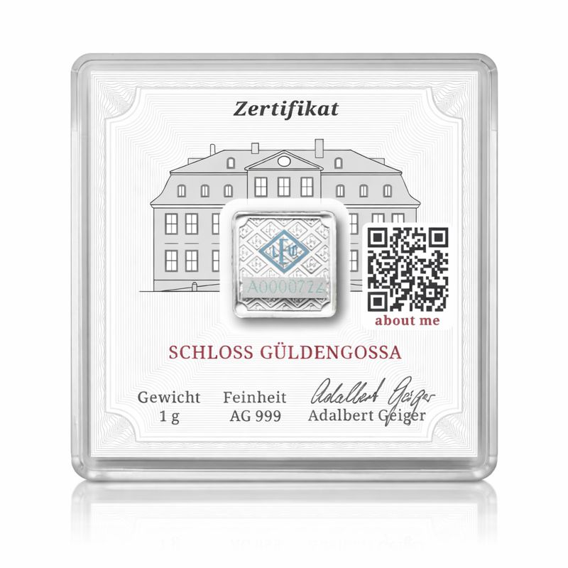 The obverse displays the elegant Schloss Gรผldengossa, a symbol of Geigerโs heritage, surrounded by a matte finish and ribbed edges. The reverse features a micro-engraved LEV rhombus pattern and a unique serial number for added security.