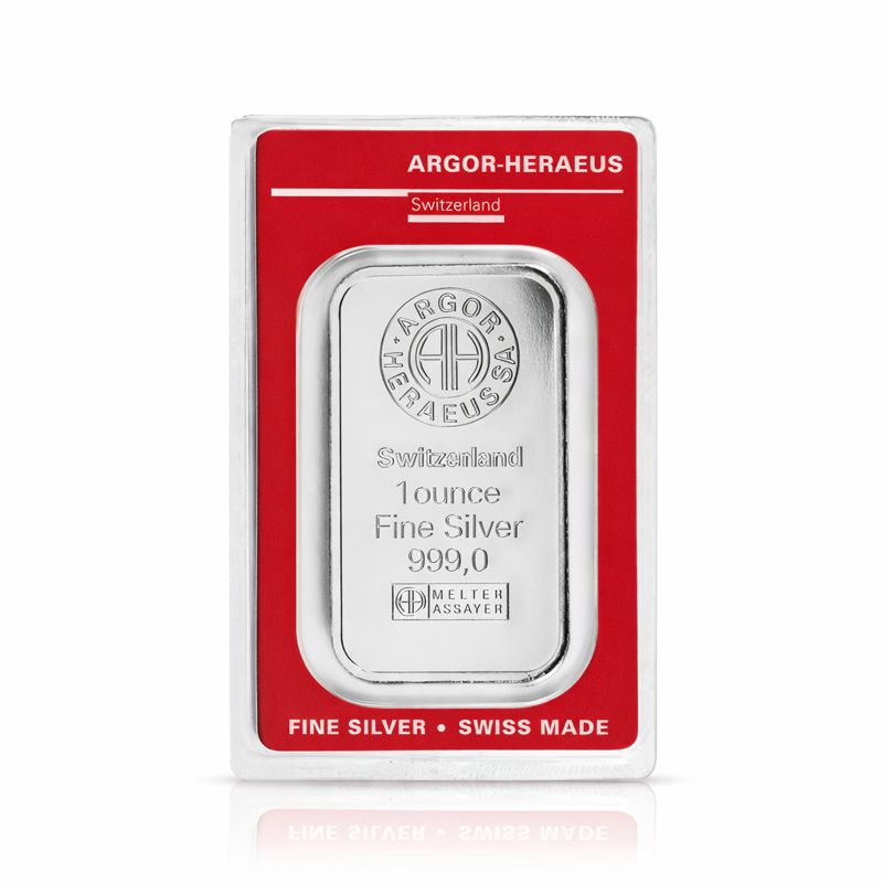 The 1 Ounce Argor-Heraeus Silver Bar is a high-quality investment-grade bar made from .999 fine silver and weighs exactly 1 troy ounce. Produced by the globally recognized Argor-Heraeus refinery in Switzerland, this bar comes sealed in a tamper-evident assay card certifying its weight and purity.