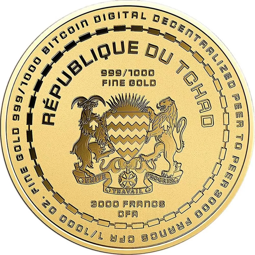 The obverse features the national coat of arms of Chad, along with the coinโs denomination and year of issue. The reverse showcases a bold and modern Bitcoin logo, symbolizing the fusion of traditional gold and digital currency.