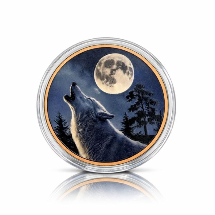 The obverse features a powerful design of a lone wolf howling under a moonlit sky, surrounded by rugged terrain and forest accents. The word โCanadaโ and โWolfโ are boldly inscribed around the rim. The reverse includes the weight, purity, and often a maple leaf or stylized wilderness motif, depending on the mint.